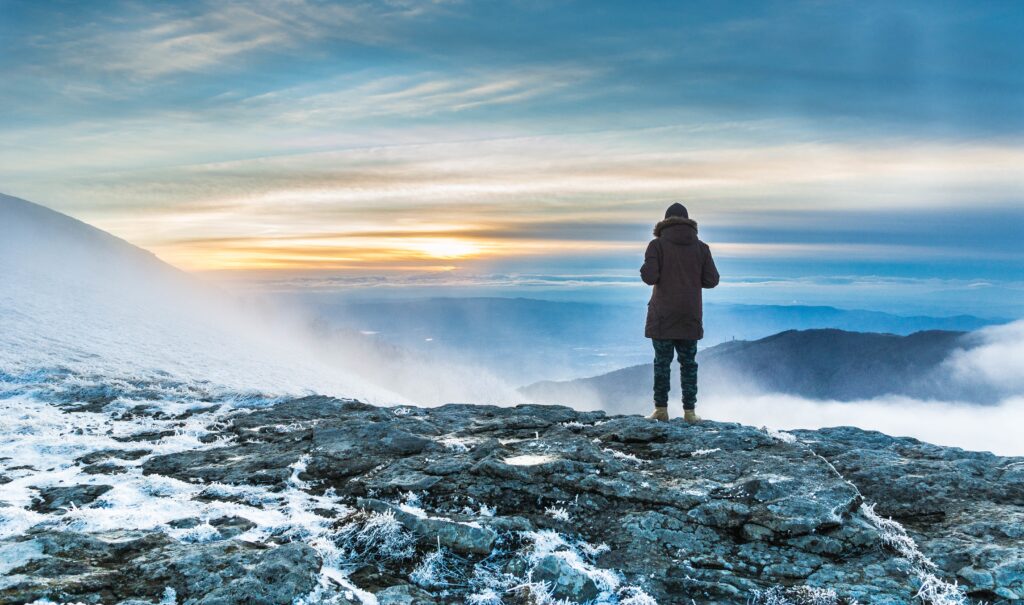A person standing on a snow covered cliff over the breathtaking view of the mountains under the sunset